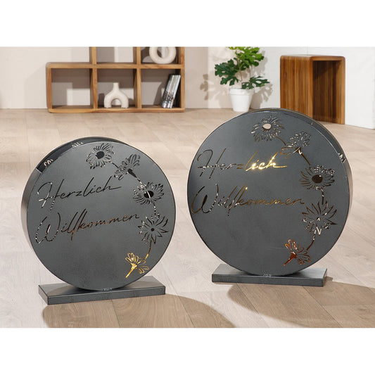 2er Set Windlicht Set Herzlich Willkommen Schriftzug H45cm Grau Metall 2 teilig Antik