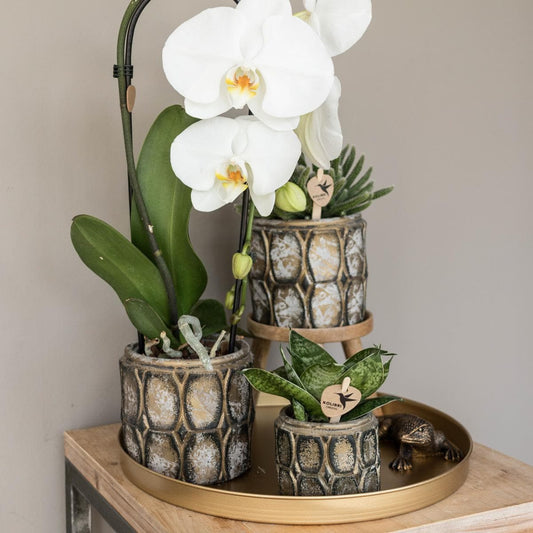 Elegantes Pflanzenset in Silber | Kolibri Orchids Weißer Phalaenopsis & Sukkulenten-Duo in Silbernen Dekotöpfen | Inklusive Bambustablett