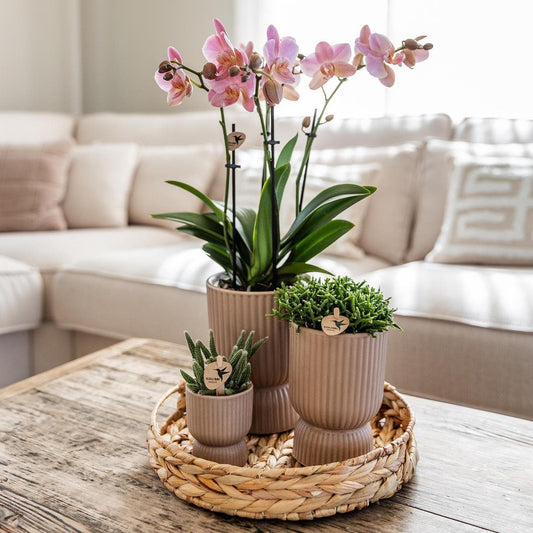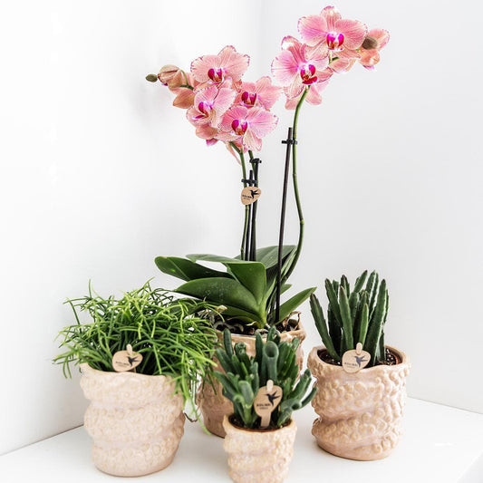 3x Orchideen & 3x Rhipsalis Rosa Zimmerpflanzen Orchideen Andorra | Kolibri Orchidaceae Schmetterlingsorchidee im Schilfkorb inkl. Wassertank