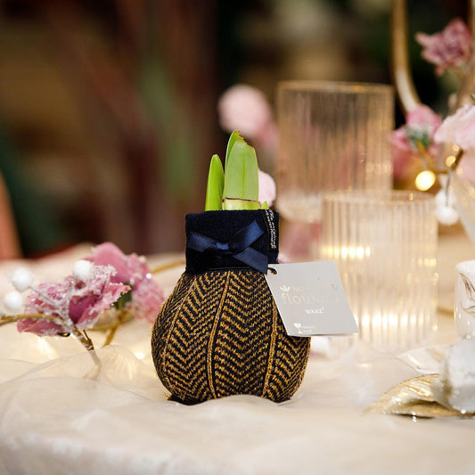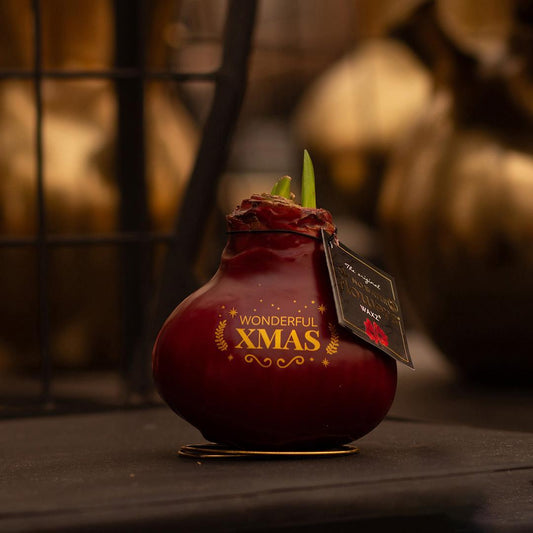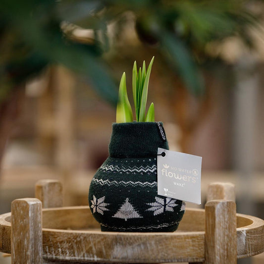 Amaryllis No Water Rote Blumen mit Wachs + Stoffhülle und Schleife - Pflegeleichte Blühende Zimmerpflanze in 3 Farben (Gold - Silber - Bordeaux) - Weihnachtlicher Sweater Stil