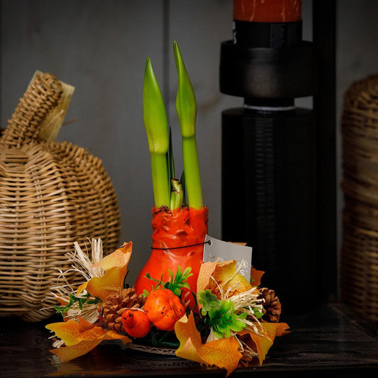 Amaryllis NoWater rote Blumen mit Herbstkranz - Pflegeleichte Blühende Zimmerpflanze mit Herbstdekoration Orange