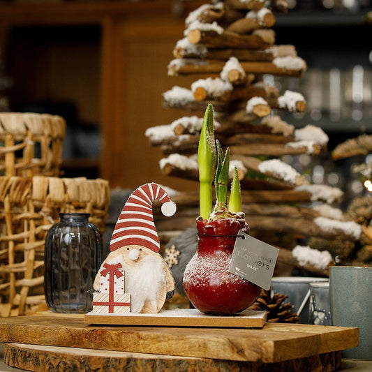 Amaryllis NoWater rote Blumen Winter Wonderland - Pflegeleichte Blühende Zimmerpflanze mit Weihnachtsdekoration Figuren in 3 Farben Rot Schwarz Weiß