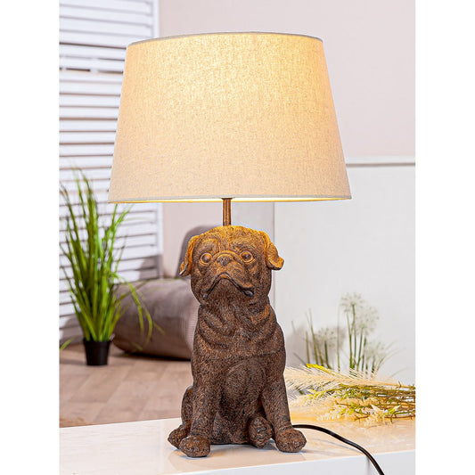 Tischlampe mit Mops Figur H52cm Kunstharz Braun Vintage Design mit Schirm Dekoration