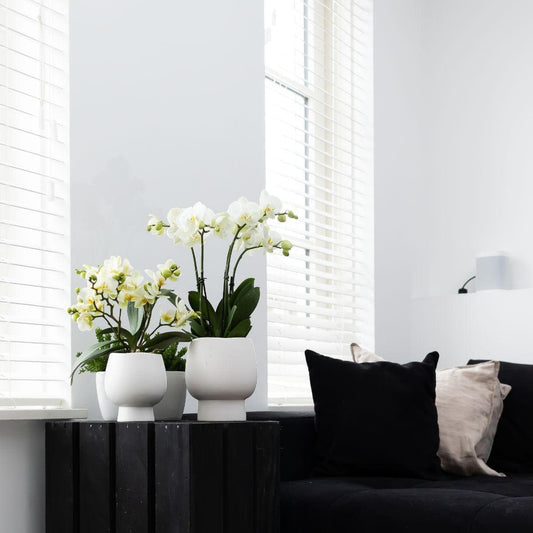 Complete plant set Scandic white | Green plant set with white Phalaenopsis orchid and succulents including ceramic decorative pots
