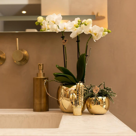 Kolibri Company | Elegant orchid set 'Amabilis' & succulent in silver pots | Luxury decor for a modern ambience