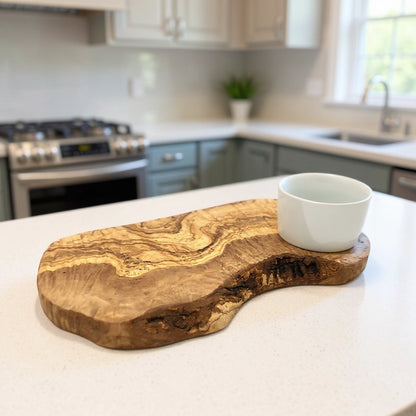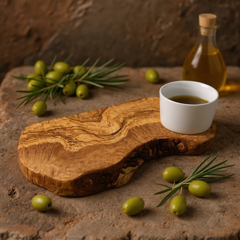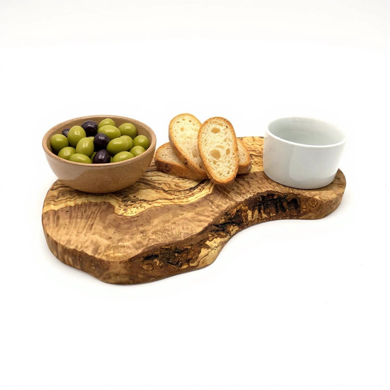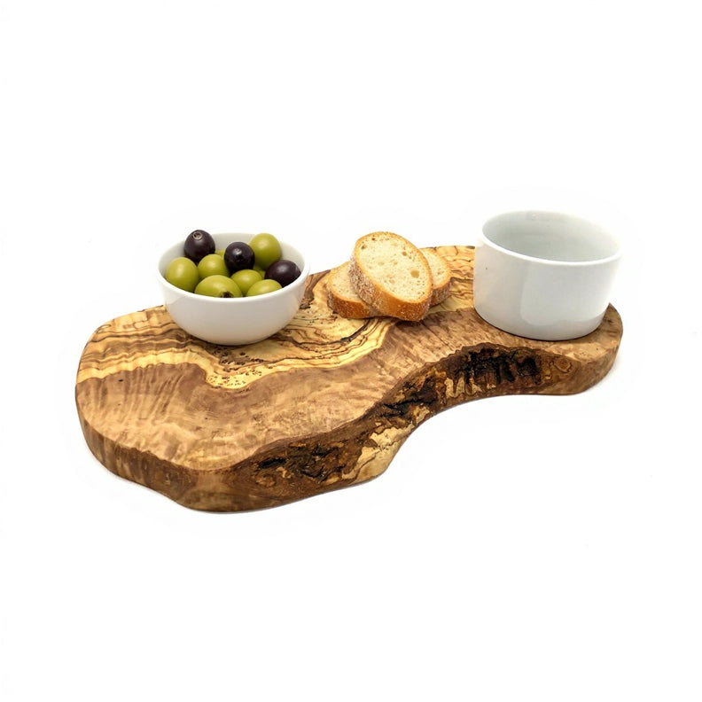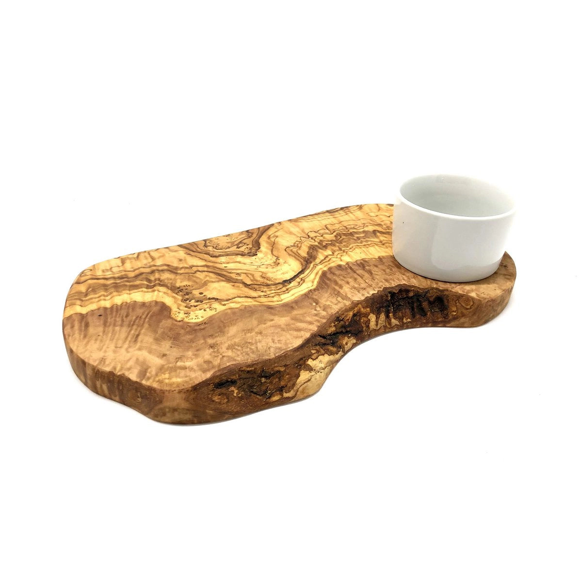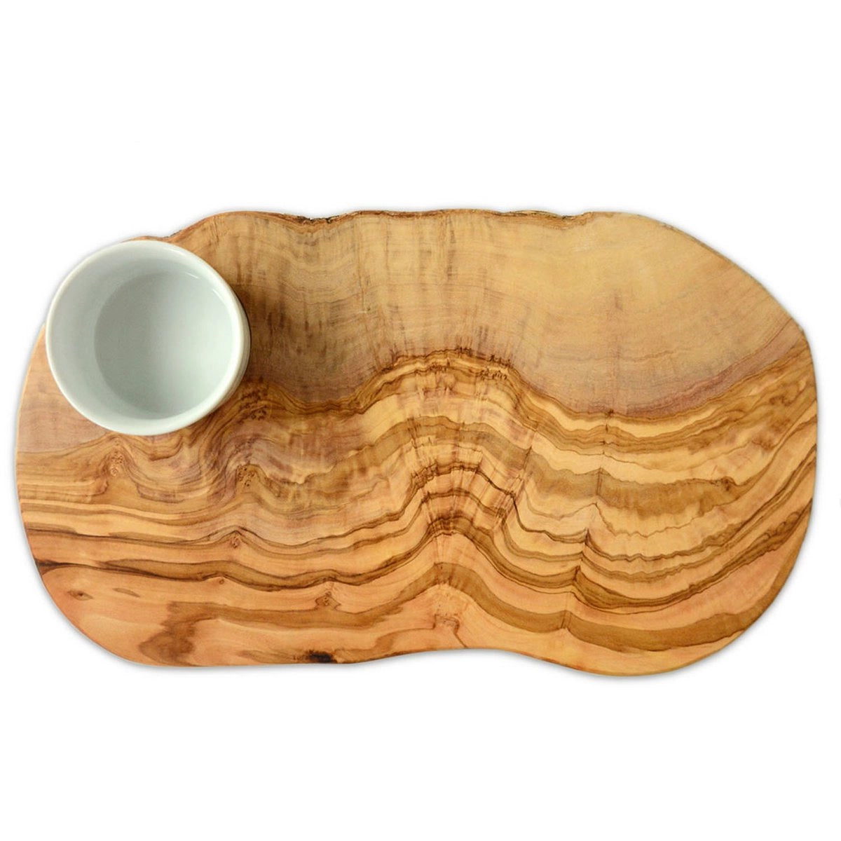 Burgerbrett 30–34 cm inkl. Porzellanschale aus Olivenholz – vielseitiges Olivenholzprodukt