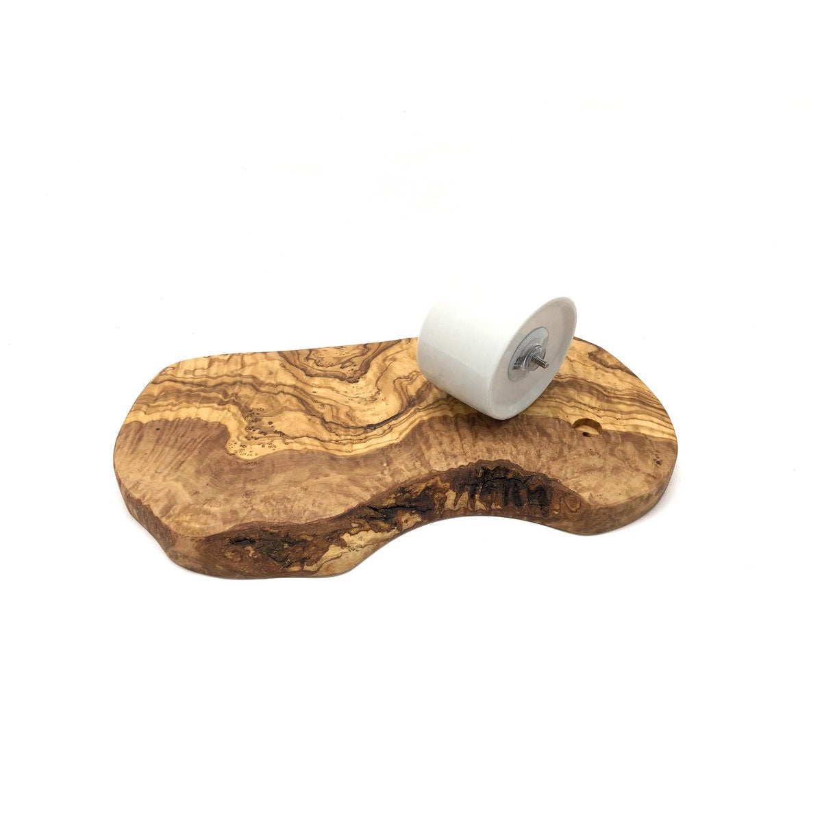 Die im Lieferumfang enthaltene, elegante Porzellanschale (Ø 8 cm, Höhe 5 cm) ist per cleverem Saugnapf sicher im Brett fixiert – kein Verrutschen, kein Kleckern. Gleichzeitig kann sie zur Reinigung einfach abgenommen werden. Die intensive Maserung des Olivenholzes und die warme Farbgebung machen jedes Exemplar zu einem echten Unikat.
