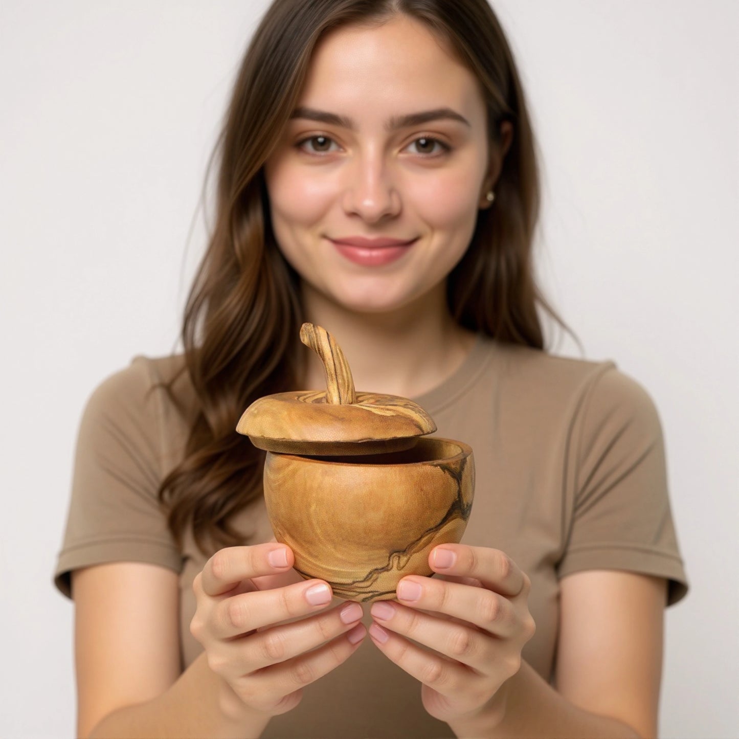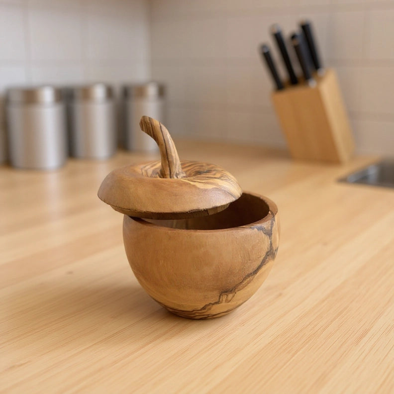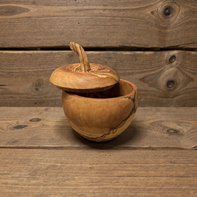 Dieser Apfel ist ein echtes Schmuckstück: Die Dose in Apfelform aus Olivenholz ist nicht zum Verzehr gedacht, sondern als stilvolle Aufbewahrungslösung für Küche, Bad oder Wohnraum – natürlich, handgefertigt und mit einzigartiger Maserung.