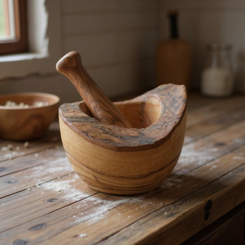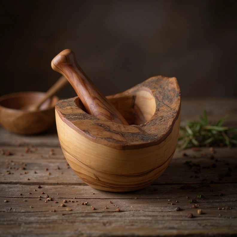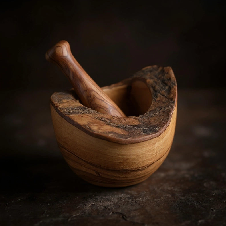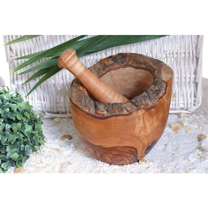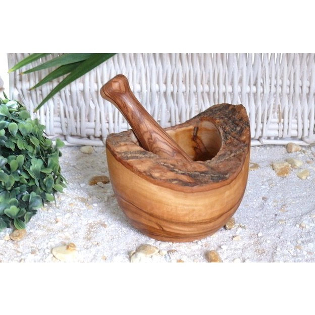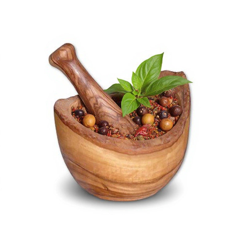 Mörser rustikal Ø 12 cm inkl. Stößel aus Olivenholz – kraftvolles Olivenholzprodukt