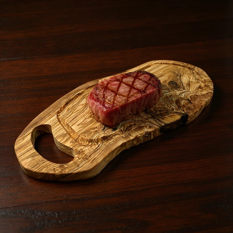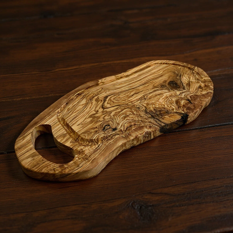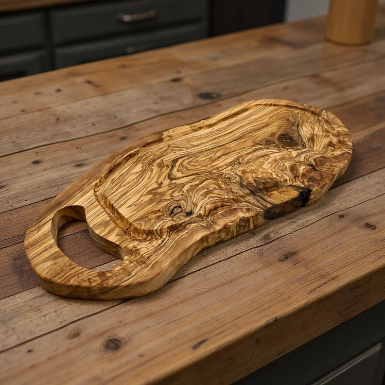 Steakbrett 40–44 cm mit Saftrille & Griff aus Olivenholz – rustikales Olivenholzprodukt
