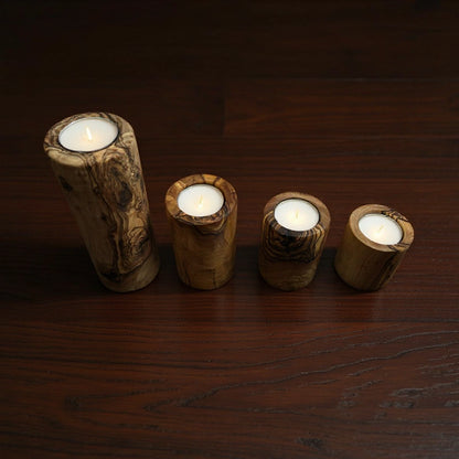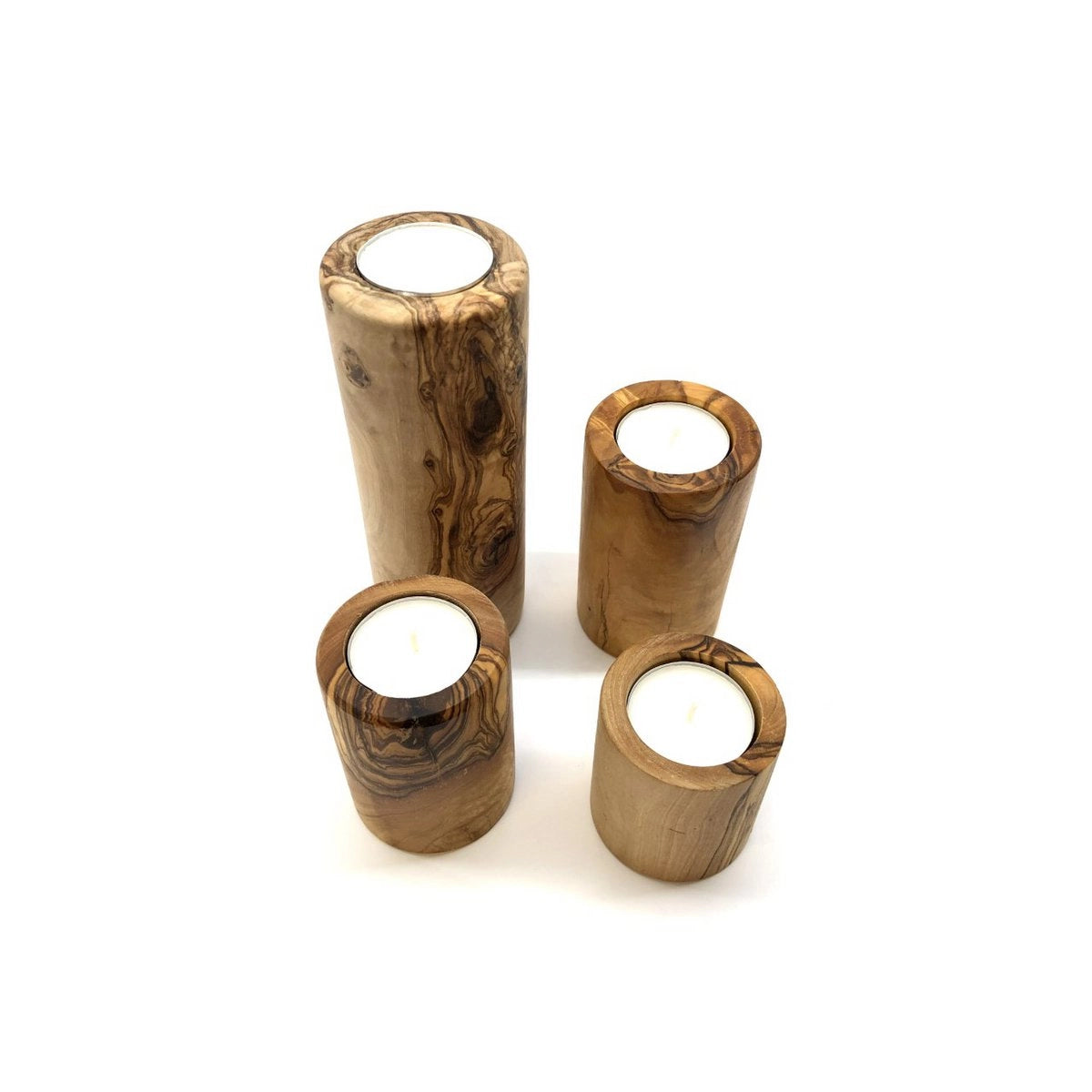 - Set-Inhalt: 4 Teelichthalter aus Olivenholz in unterschiedlichen Höhen